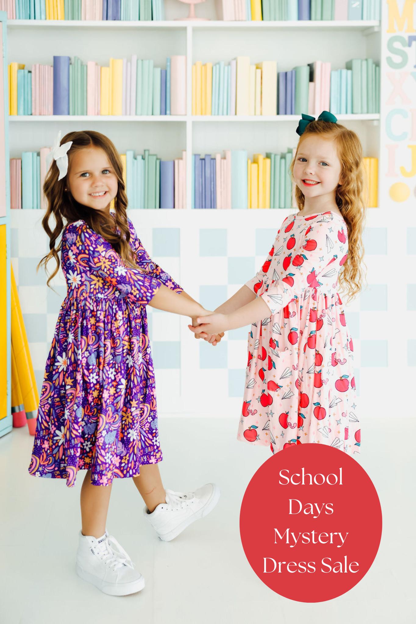 Your favorite sale is now available with a School Days twist! ✏️ Get ready for a surprise package filled with 3 dresses inspired by school-day adventures and favorite “subjects” like dinosaurs, astronauts, art, and more! Each pack may includes a mix of 3/4 sleeve and short sleeve dresses —perfect for the girl who loves to learn, play, and twirl her way through every day.