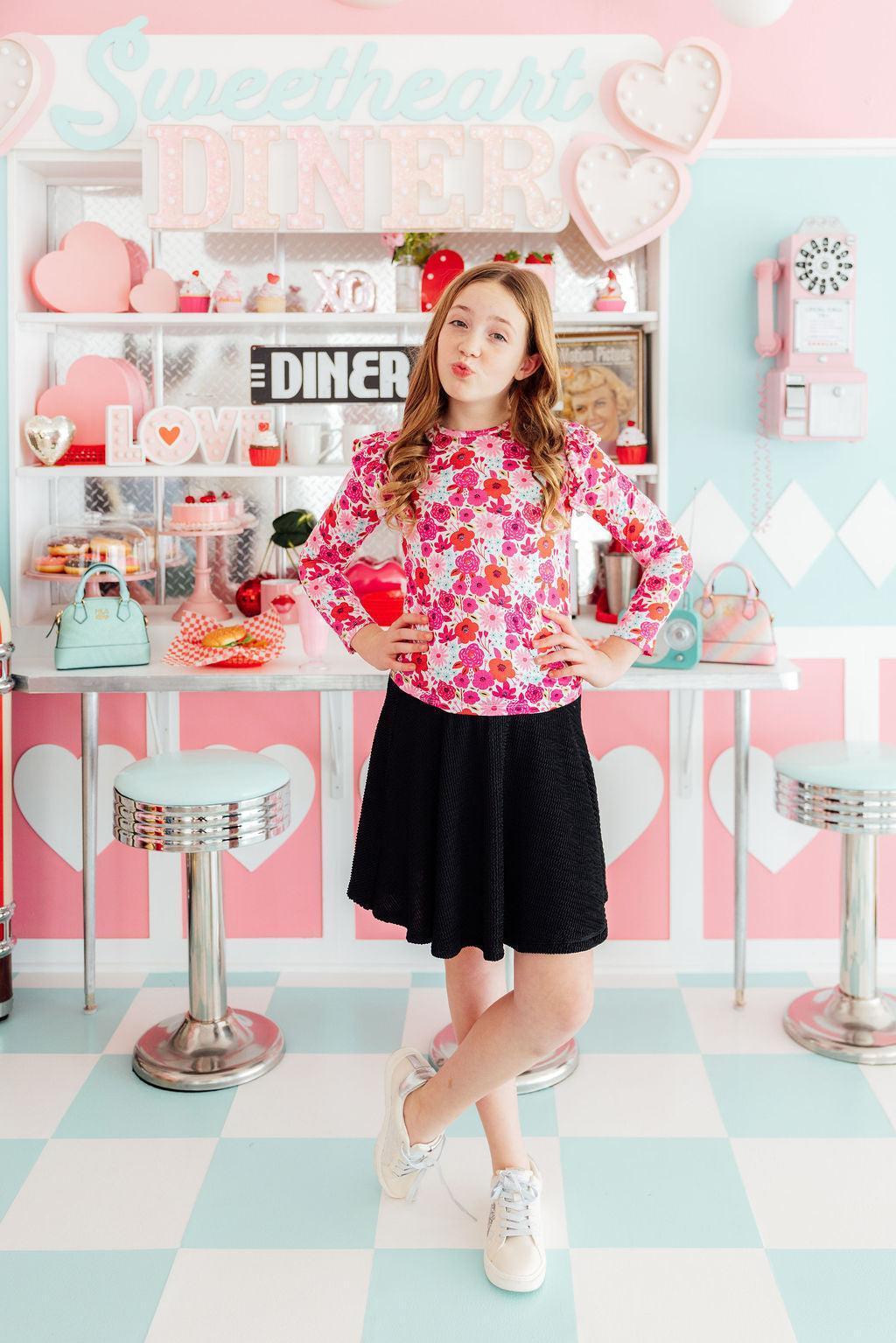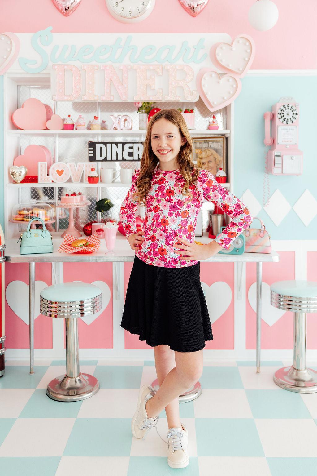 Our ruffle tee in vibrant prints is a favorite to pair with solid twirl skirts, leggings, or layered under a pinafore!  Mix and Match our Secret Garden print collection for sisters, cousins, or BFFs.