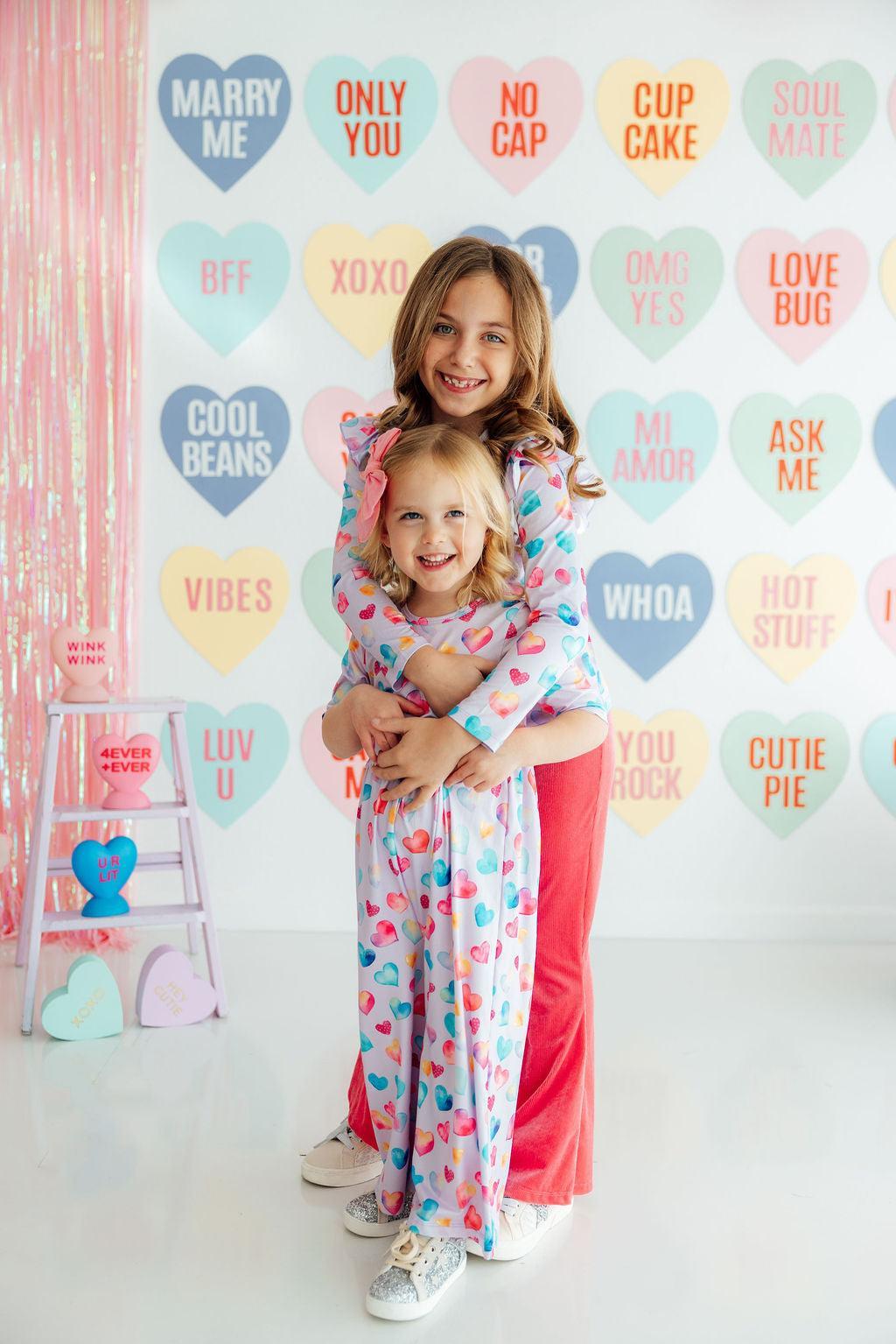 Our ruffle tee in vibrant prints is a favorite to pair with solid twirl skirts, leggings, or layering. Mix and Match our Watercolor Kisses print collection for sisters, cousins, or BFFs.